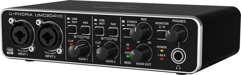 O UMC204HD é uma interface de áudio HD da Linha U-Phoria, que facilita a realização de suas gravações em poucos minutos com toda a conectividade necessária para seus microfones, guitarras, teclados e até mesmo dispositivos MIDI. A interface possui 2 pré-amplificadores Midas e USB 2.0. Além de contar com uma resolução de áudio de 24 bits/192kHz. Esta interface de gravação conta ainda com uma poderosa saída de fones com controle de Level e botão de Direct Monitor. A U-Phoria UMC204HD acompanha código para download de software de gravação, edição e podcast de áudio e 150 plug-ins de instrumentos e efeitos disponíveis para download no site da Behringer. A UMC204HD Behringer ainda é compatível com os principais softwares de gravação (DAWs) do mercado, e possui uma construção robusta com uma carcaça em metal resistente a impactos.