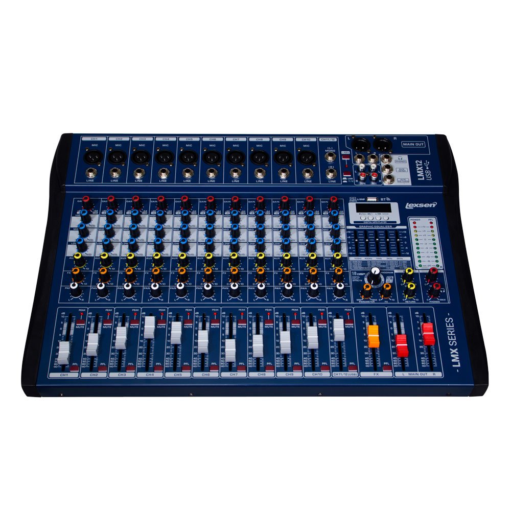 Com ele, você tem 10 entradas XLR para conexão de microfones dinâmicos ou condensadores com Phantom Power 48V e 10 entradas P10 para conectar seus instrumentos, e no canal 11/12 temos uma entrada de canal estéreo. Além dessas entradas, o mixer possui entrada MP3 e conexão Bluetooth, para receber e transmitir áudio do seu celular ou computador diretamente para a sua caixa de som. Em cada canal o LM12 tem ajuste de Gain, High, Mid, Low, Aux, Eff e Pan, além disso, possui Mute, LED de pico e fader individual de volume por canal. A mesa tem saída L/R para caixa de som, saída para fone, aux send e return.