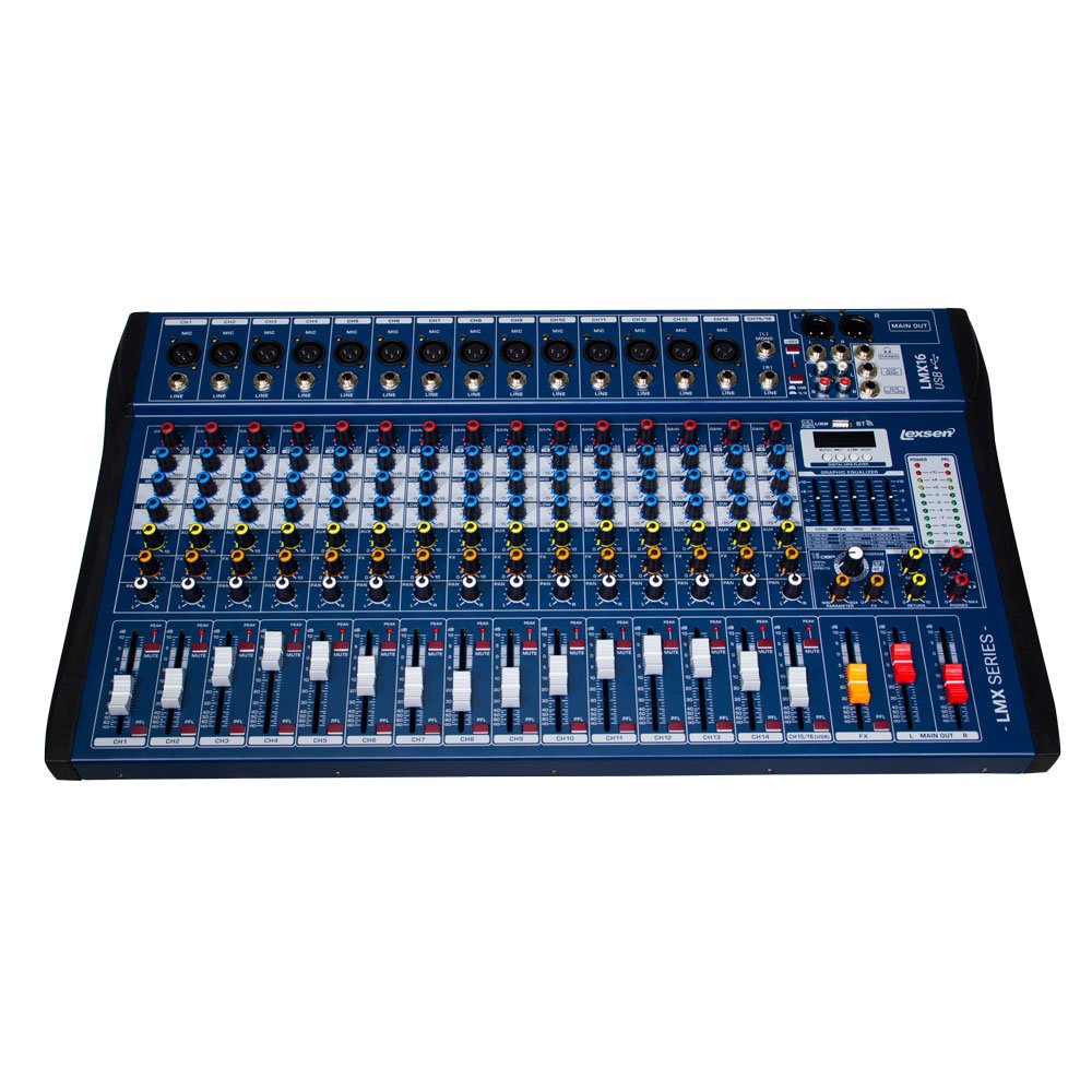 O mixer de áudio LMX16 da Lexsen é uma mesa de som compacta e poderosa com 16 canais, que permite a conexão de todos os seus dispositivos para montagem de um sistema completo de mixagem, e faz parte da LMX Series, uma linha de mixers especialmente desenvolvida para atender a sua necessidade. Com ele, você tem 14 entradas XLR para conexão de microfones dinâmicos ou condensadores com Phantom Power 48V e 14 entradas P10 para conectar seus instrumentos, e no canal 15/16 temos uma entrada de canal estéreo.
