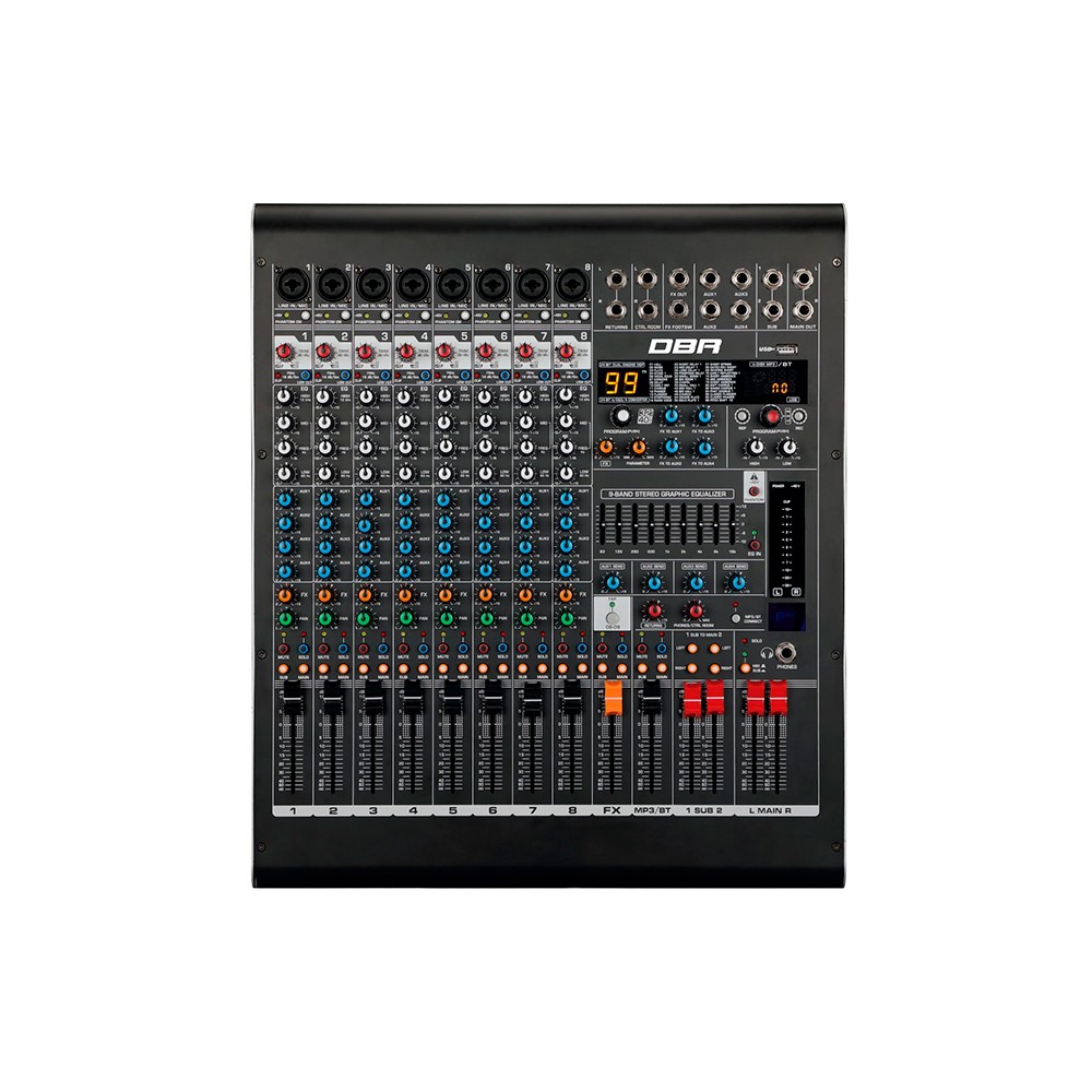 O Mixer DM8 da DBR foi especialmente projetado para atender a uma grande gama de utilizações, proporcionando desempenho superior, qualidade de som e confiabilidade, com o melhor custo benefício. O processador FX possui os principais tipos de efeito do mercado, sendo estes: Reverbs, Delays, Chorus, Flanger e Phaser, e ainda possui uma vasta combinação destes proporcionando 99 presets de efeito que podem ser ajustados para personalizar a sua mixagem. Suas diversas possibilidades de conexão foram projetadas para máxima compatibilidade com o seu sistema de som, a interface USB/PC possibilita mixagem e gravação de qualidade profissional com total integração e controles específicos, utilizando o seu computador.