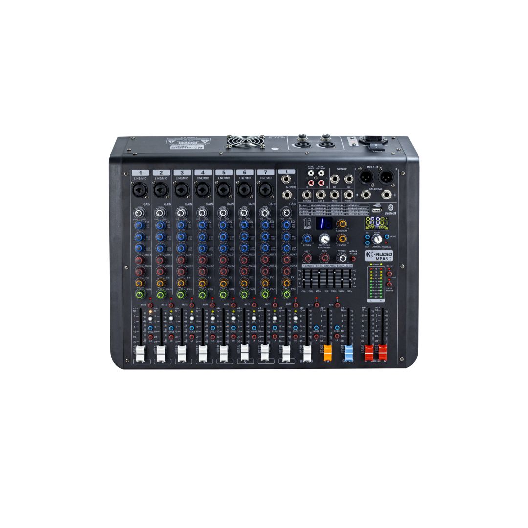 Composta por 8 canais de entrada, a KAUDIO MPA 8.2 é uma mesa ativa e proporciona uma ampla gama de opções de conectividade para instrumentos musicais, microfones, dispositivos de reprodução de áudio e muito mais. Cada canal oferece controles precisos de equalização e ganho, permitindo ajustes detalhados para alcançar o som desejado. Além disso, esta mesa de som apresenta um sistema de amplificação integrado, eliminando a necessidade de equipamentos adicionais em aplicações onde o espaço é limitado ou a portabilidade é essencial. Seu amplificador embutido oferece potência suficiente para alimentar alto-falantes com eficiência, garantindo uma reprodução de áudio limpa e potente. Com controles de volume mestre e monitoramento dedicados, juntamente com saídas de áudio balanceadas e não balanceadas, a KAUDIO MPA 8.2 proporciona flexibilidade total sobre o mix final e a capacidade de monitorar com precisão o áudio em tempo real.