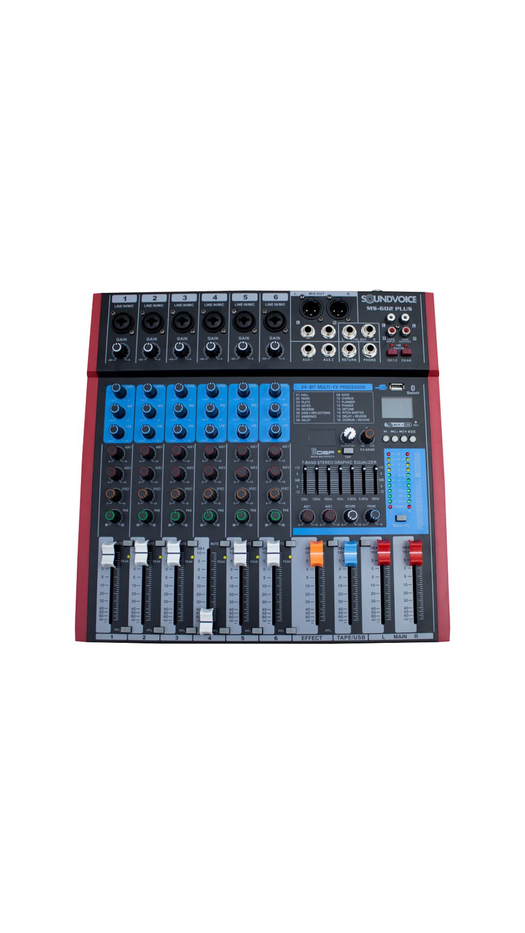 A Soundvoice MS-602 Plus é uma mesa de som analógica projetada para oferecer praticidade e desempenho em ambientes profissionais e amadores. Com 6 canais combo (XLR/P10), ela permite mixagens precisas e criativas, seja em estúdios, igrejas, eventos ou apresentações ao vivo.