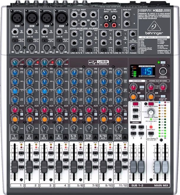 O XENYX X1622USB da Behringer é um mixer de som com 16 entradas, e com uma interface de áudio USB integrada. Este mixer permite a mixagem e o envio dos múltiplos sinais de áudio para várias saídas. O mixer possui quatro pré-amplificadores de microfone, equalizador de 3 bandas de estilo 'britânico', e quatro compressores com um botão 'One-Knob' que centraliza tod configuração em um só botão.