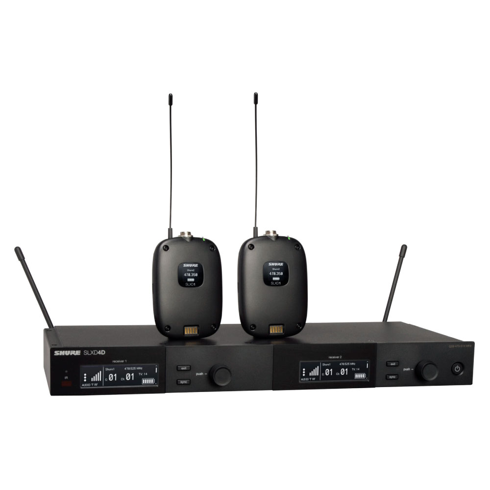 O receptor SLXD4D de dois canais para montagem em rack, totalmente metálico, possui duas interfaces LCD intuitivas com medidores de RF, status da bateria e input de áudio. Ele também oferece 60 dB de controle de ganho e obtenção de instrumento XLR de mic / linha e 1/4 "para cada canal. Recursos adicionais incluem varredura automática de frequência e sincronização de infravermelho para conectar facilmente o transmissor e o receptor à frequência de frequência.