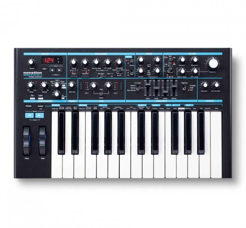 Mono sintetizador analógico Novation Bass Station II, 25 teclas fullsized com sensibilidade a velocidade do toque, clássico gerador de forma de onda analógico, 2 osciladores multiwaveform com um sub oscilador separado, pitch e mod wheels, MIDI, USB.